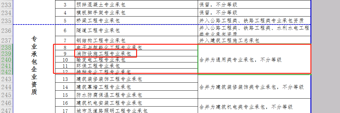 其中:消防設施施工專業承包資質和其他幾項資質合并為通用類專業承包,不分等級。
